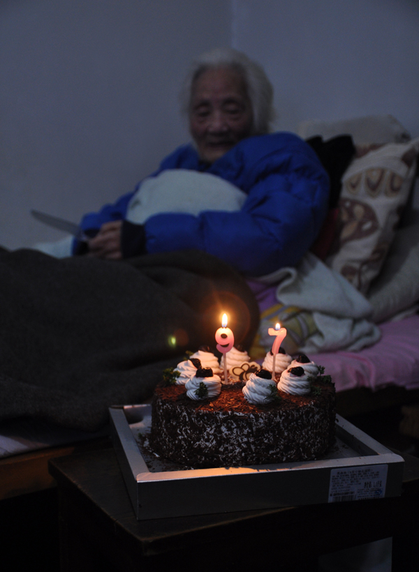 親愛的外婆現(xiàn)年97高齡了,人老了走不動,還在躺床養(yǎng)老,孫女特地買了香甜可口的蛋糕送到外婆面前,讓她驚喜一下!帶有“97”兩個數(shù)字的小蠟燭點亮了,立即響起歡快的生日歌,祝外婆97歲生日快樂!祝愿她百歲長壽!她高興地拿著水果刀等切蛋糕,讓我們好好分享!
