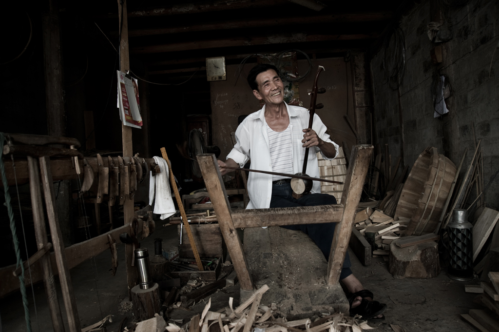 黃巖嶼頭老街上一木工師傅在工間閑來拉上一曲。