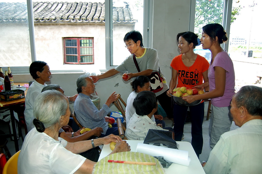 2012年7月18日,浙江體育學(xué)院暑期社會實踐大學(xué)生自掏腰包買來桃子,送給上盤鎮(zhèn)敬老院的老人們。