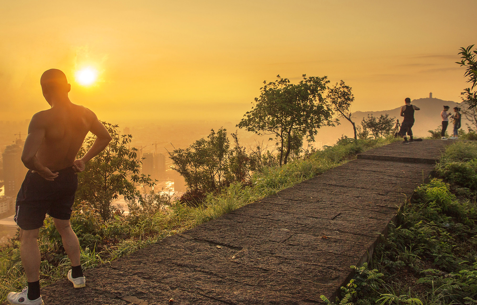 石板路從山下鋪到山頂,山頂鋪到了一個(gè)平臺(tái)。供廣大市民早鍛煉
