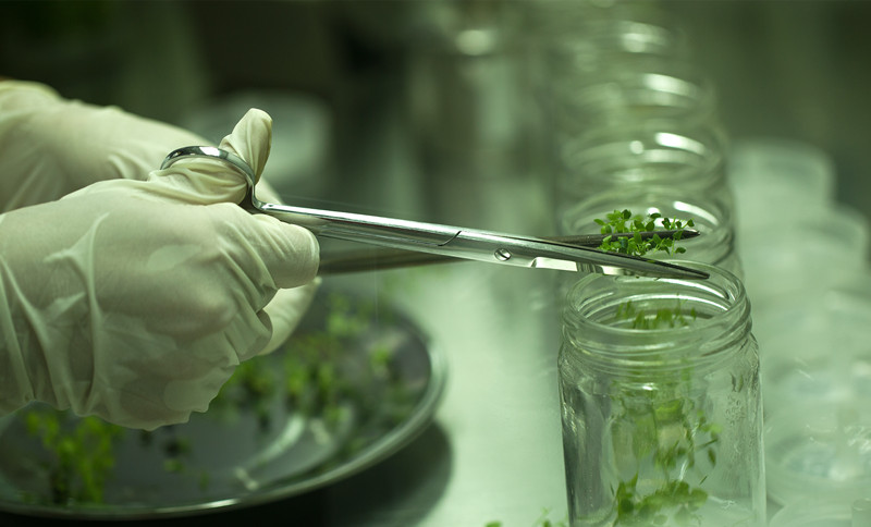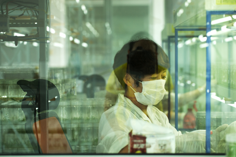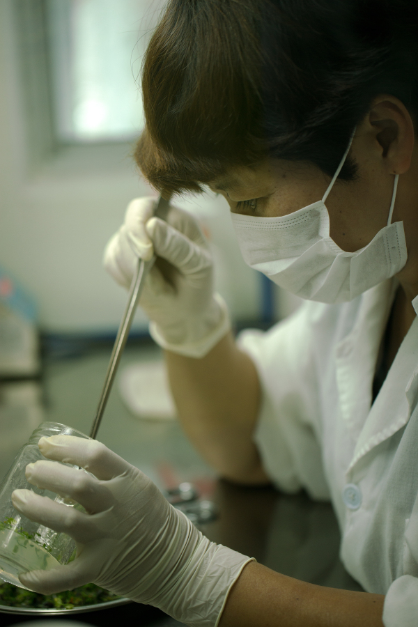 返回頂部>> 照片說(shuō)明:  恒溫的組培實(shí)驗(yàn)室,技術(shù)員在細(xì)心查看種苗的生長(zhǎng)情況