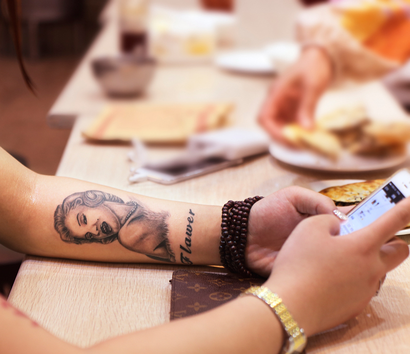 這種瘋狂折騰、自虐或追求,源于高度的身體意識,以及對身體特別是身體外部視覺效果與外人評價的在意,并由此形成了服務身體的完善的身體工業(yè)(從服裝、化妝品、醫(yī)學整容到美甲、手鏈、體重稱等),而刺青,正是這個身體工業(yè)中的小小一環(huán)?梢哉f,小小一片刺青,一邊勾著個人糾結,一邊連著社會文化。