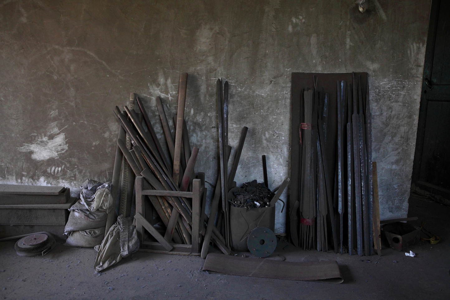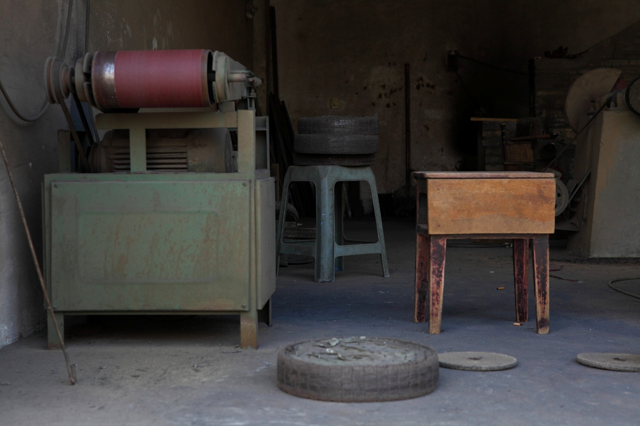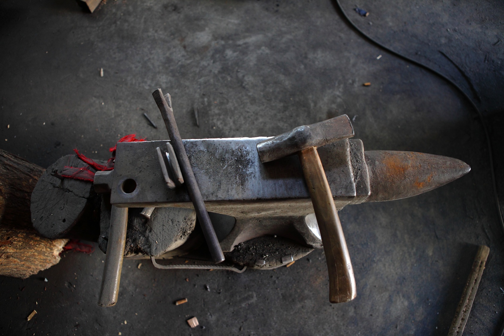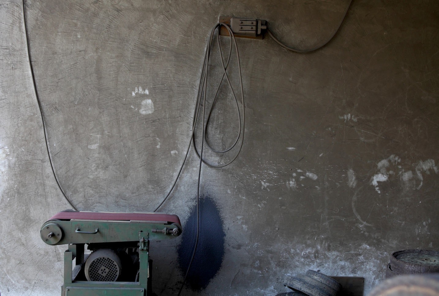 系列照片記錄的正是這樣大環(huán)境的一個小型鑄劍工作坊,工作坊只有夫妻二人,這里沒有深厚的鑄劍文化;沒有高深的鑄劍技;沒有高新的鑄劍設備;也沒有現(xiàn)代的工作環(huán)境。有的是作坊經(jīng)營的壓力;低成本營運下的艱苦環(huán)境;傳統(tǒng)手工鍛造與電機設備的結(jié)合;長期鍛造打磨寶劍的金屬粉塵將作坊烙上獨特的色彩,各類加工器具、設備擺設均稱為一道獨特的景觀,這景觀默默的呈現(xiàn)著一種難以名狀的當今復雜的中國制劍文化與制作手工藝人的生活狀態(tài)。