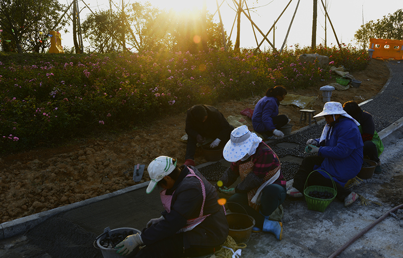 作品介紹: 湖漫水庫(kù)旁興建植物園,工人們正在鋪設(shè)鵝卵石路。