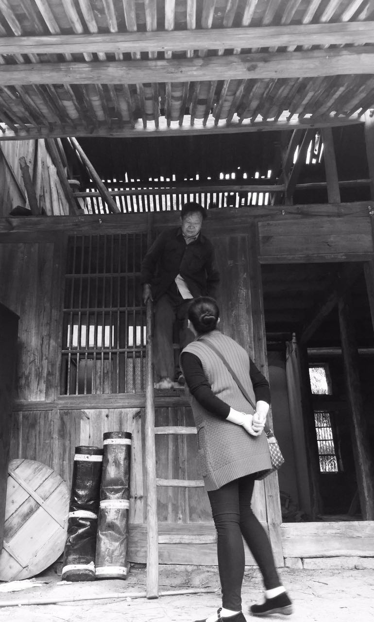 臨海古村落,拍攝一位瓦工從房屋下來,其老伴看著瓦工下來的剎那,屬于人物片,拍攝時間2015.11.8