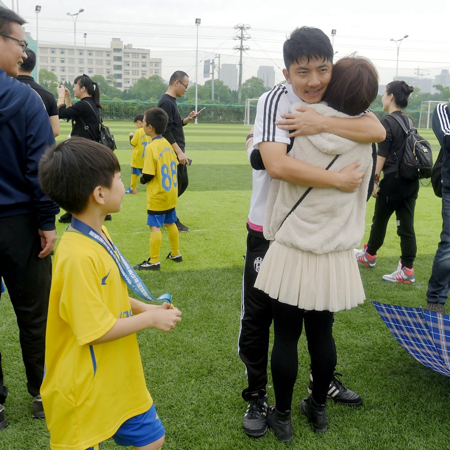 冠軍隊(duì)的教練領(lǐng)獎(jiǎng)后,跟妻子擁抱在一起,感謝她背后默默地付出。