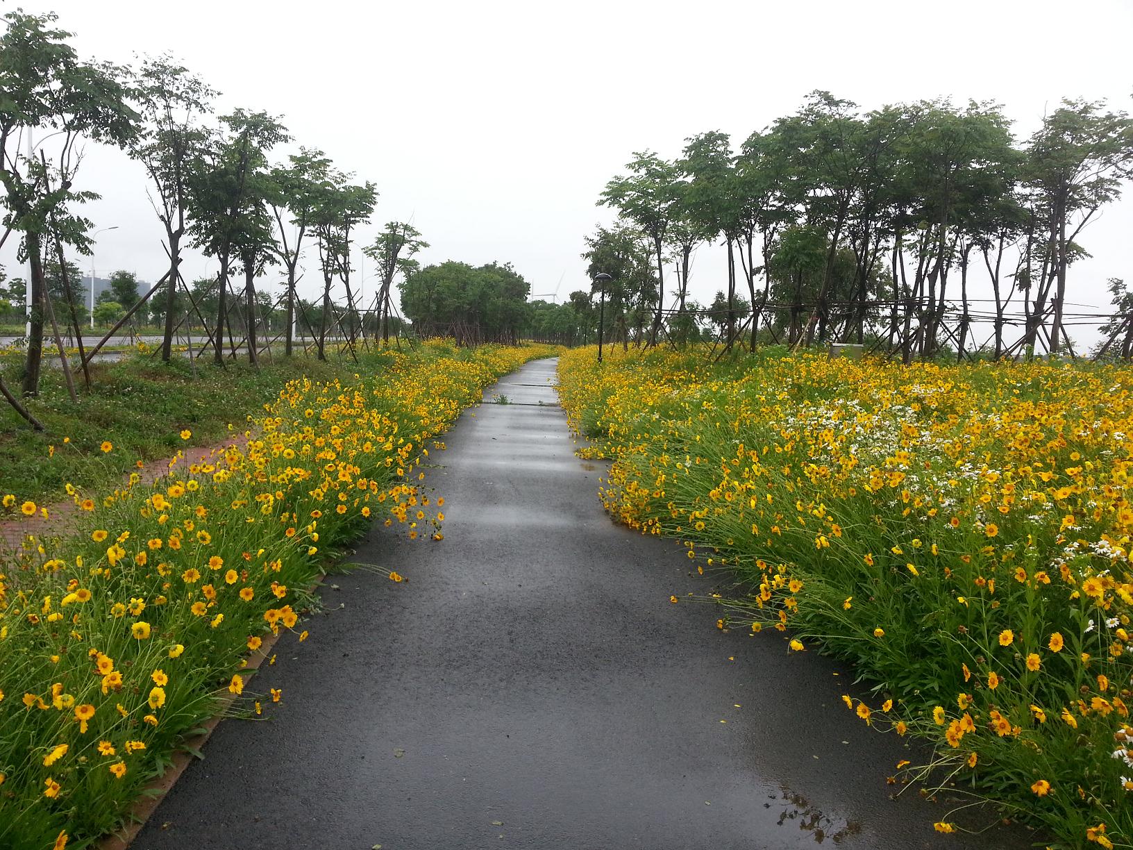 人行道兩邊波絲菊美麗綻放 。好美的花路啊!
