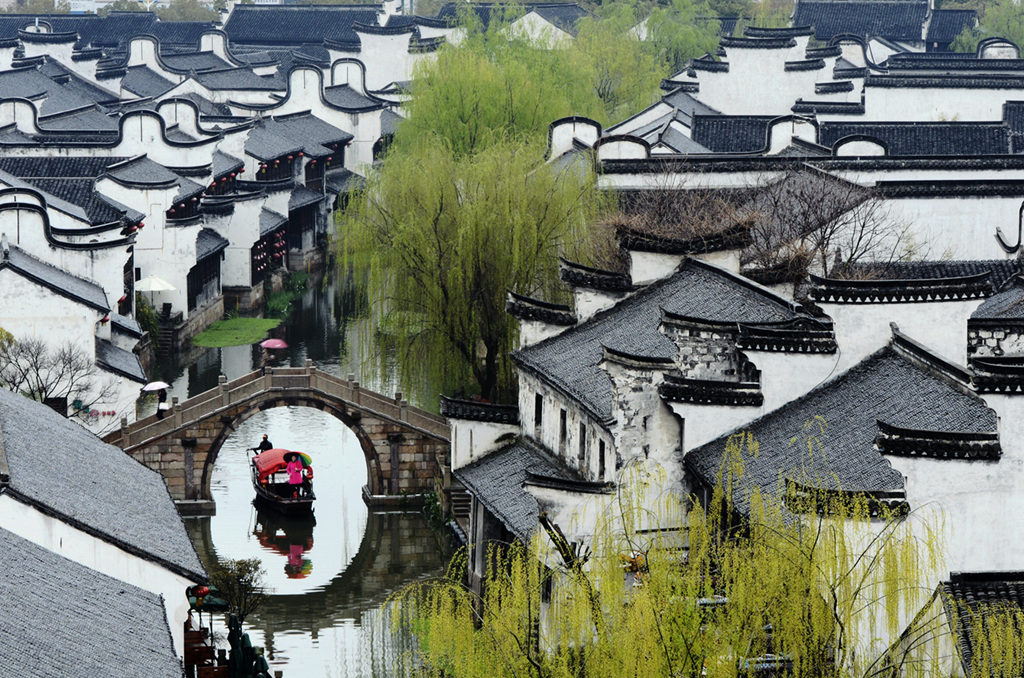 初春的江南,柳芽初綻,細雨中小船悠悠,游客三倆,嘉興的月河在寧靜中等待春的來臨。