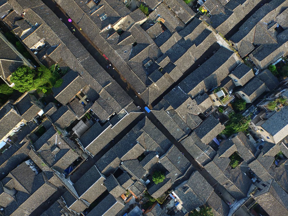 紫陽古街的十字街頭,用鳥瞰的視線拍攝古街屋頂瓦片的整齊排列。