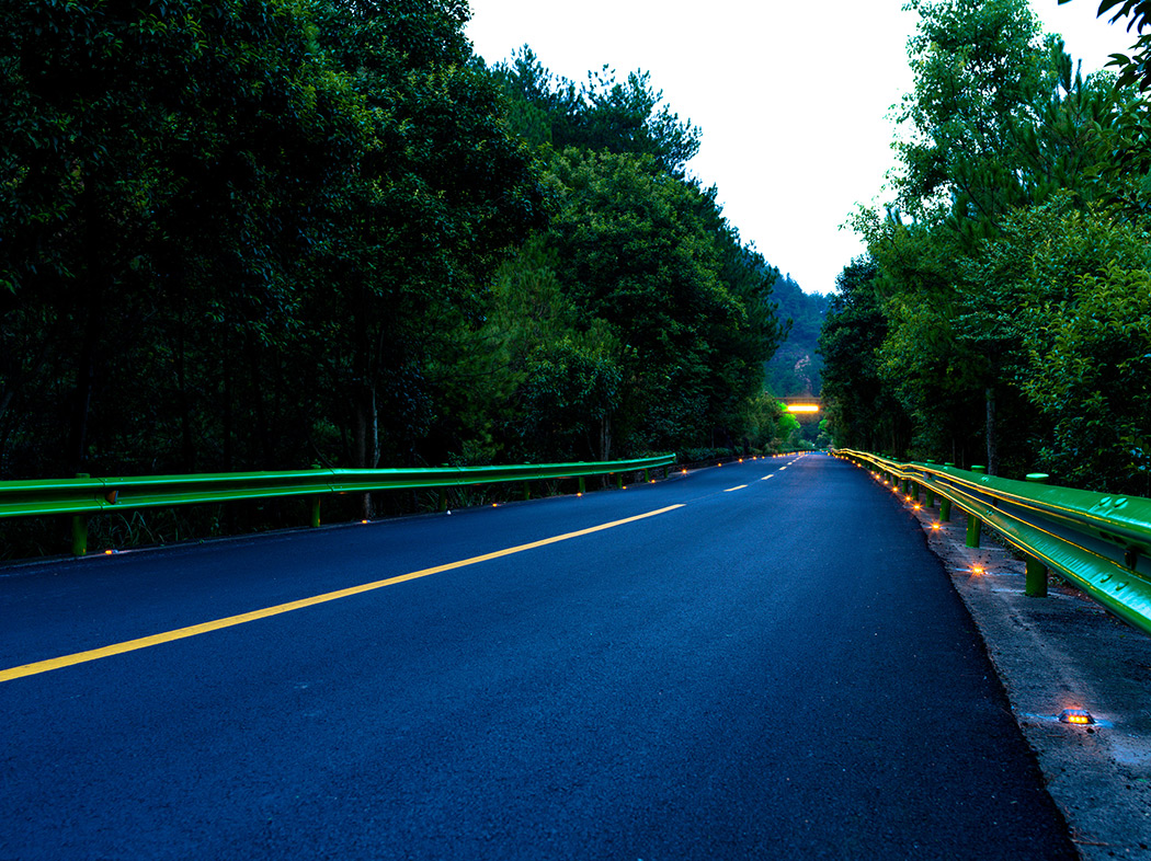 天臺縣天北公路,綠色的防護欄與自然相融為一體,太陽能夜光的警示燈,保障著車輛與行人的安全。