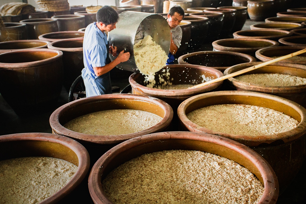 返回頂部>> 照片說明: 已有25年釀酒經(jīng)驗(yàn),來自安徽的馮正利,和同事合力將蒸熟的米飯倒入已發(fā)酵24小時(shí)的釀缸中,行話叫“喂飯”,加入新蒸熟的米飯,能使酒釀中的酵母更好地持續(xù)發(fā)酵,生成大量酒精。
