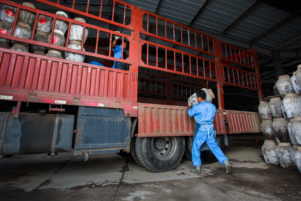 返回頂部>> 照片說明: 來自安徽的汪運(yùn)榮,從事釀酒行業(yè)28年,正與同事一起將新釀出來的酒搬運(yùn)至酒窖貯存,并將酒窖里存放多年的陳酒轉(zhuǎn)運(yùn)至原酒倉(cāng)庫(kù),用于生產(chǎn)。
