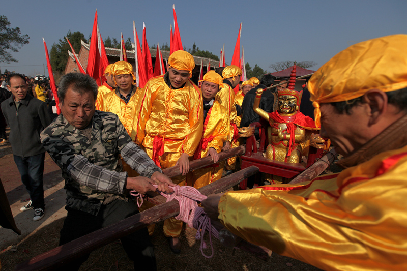正月十六日“走老爺”當(dāng)天,由幾百人組成的隊伍 敲鑼打鼓 ,手扛大旗,抬著“老爺”,繞行村莊。人人臉上洋溢著喜悅、恭敬之情。
