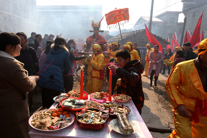 老爺經(jīng)過的路段,村民擺放貢品,焚香放炮,迎接老爺?shù)絹。祈求老爺保佑,來年風(fēng)調(diào)雨順、百業(yè)興旺、五谷豐登。