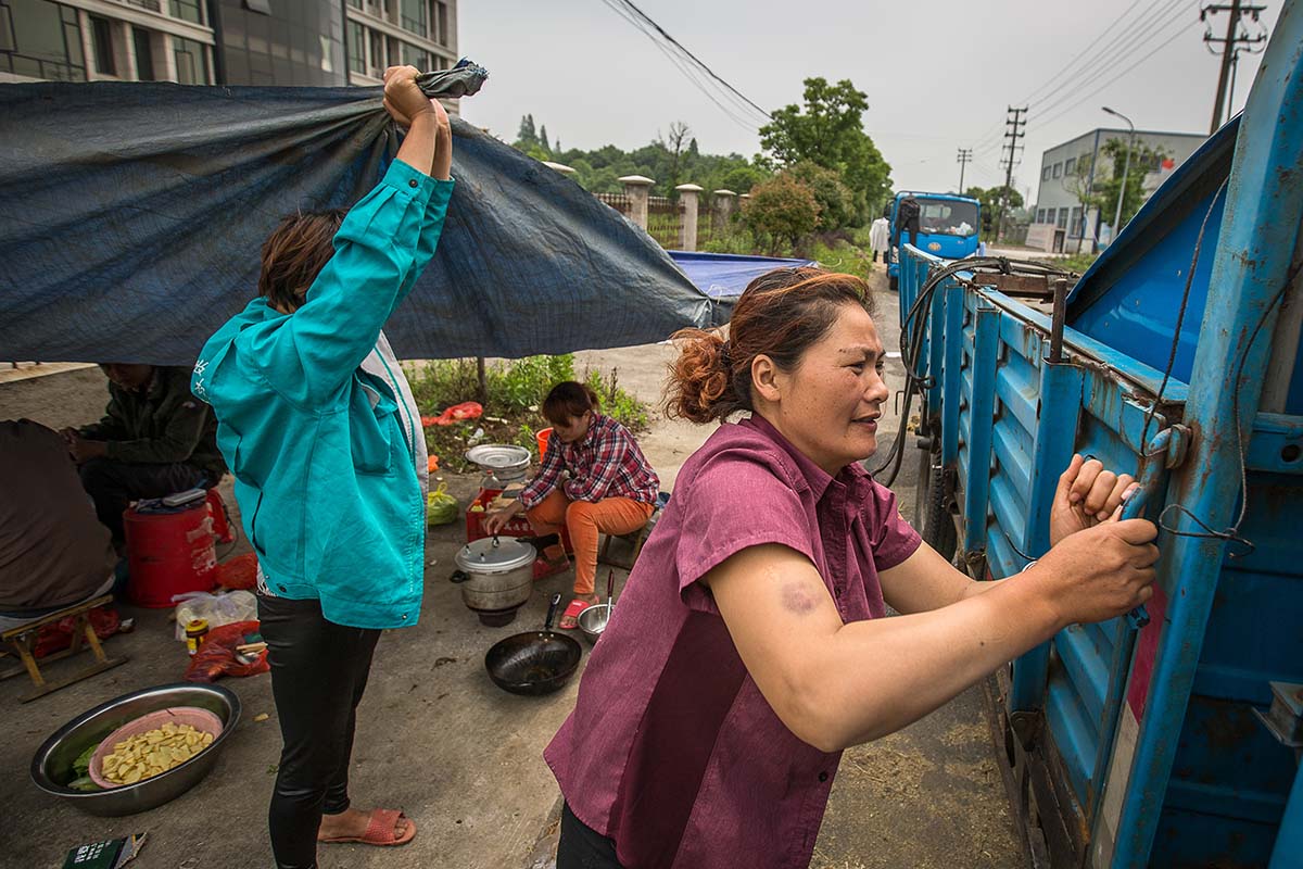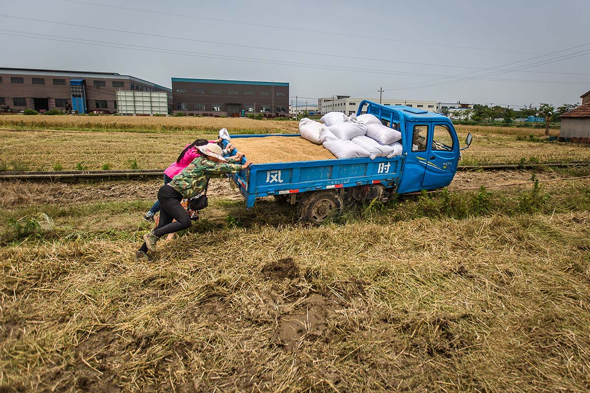 作品介紹: 麥田淘金 (圖/文 吳拯) 微風(fēng)拂過,湖州長(zhǎng)興大云寺村的數(shù)十畝金黃的麥田蕩起了層層麥浪。遠(yuǎn)處,幾臺(tái)收割機(jī)正在麥田中穿梭,轟鳴聲驚起無數(shù)躲藏在麥穗?yún)仓械娘w蟲。 每年的5月中旬,是長(zhǎng)興縣23萬畝麥子成熟的季節(jié)。近萬名收割者開著收割機(jī)云集于此,進(jìn)行“收割大業(yè)”。他們大多來自外省,被人們稱為“新麥客”。 麥客是指流動(dòng)的替別人割麥子的人,自古便有。至少在明清的中國(guó)地方志中就有記載。在農(nóng)業(yè)機(jī)械化后,大批“新麥客”駕著收割機(jī)走南闖北收割小麥,他們也被 “現(xiàn)代麥客”、 “鐵麥客”、“機(jī)械麥客”。 來自江蘇徐州的李尊成和李紅華是眾多麥客中的一對(duì)。他們來自江蘇徐州,從事跨區(qū)域收割工作三年。中飯時(shí)間,李紅華正收拾著一把蔫了的生菜,不遠(yuǎn)處她的丈夫李尊成已經(jīng)架起了自帶的煤氣罐和煤氣灶,準(zhǔn)備煮年糕。“出來能省一點(diǎn)是一點(diǎn)!崩罴t華說,不少麥客都會(huì)跟他們一樣,自帶廚炊具。 對(duì)于跟著丈夫徐為民出來跑了四五年的吳秀娟來說,豐收的場(chǎng)面已經(jīng)非常熟悉。徐為民是有七八年經(jīng)驗(yàn)的老麥客了,每年4月底,江蘇小麥逐漸成熟,這意味著徐為民夫婦便要離開兒子,開始長(zhǎng)達(dá)半年的“遷徙”。從江蘇到浙江再到安徽,后至兩廣,然后北上四川、甘肅,最后再趕回江蘇收割完最后一季稻谷。然后夫婦倆會(huì)找些臨時(shí)工作,等待著下一個(gè)成熟的季節(jié)。 中國(guó)地廣,各地麥子成熟存在時(shí)間差。麥客便在各個(gè)麥子成熟地流動(dòng)。一年中,至少有一半時(shí)間在外風(fēng)餐露宿。 麥?zhǔn)旒竟?jié),江蘇銅山的李平夫婦、周意叔侄也正整裝待發(fā)。他們組成了一支車隊(duì)——4輛車、4輛收割機(jī)、8個(gè)人,每年五月中旬趕到浙江,前來收割成熟的小麥和油菜。 此時(shí),浙江的麥田里,已經(jīng)布滿了從河南、安徽、江蘇等地前來跨區(qū)作業(yè)的新麥客們。 現(xiàn)代的麥客大都以開收割機(jī)為生,由親朋好友組成車隊(duì)。他們分工明確:男人當(dāng)機(jī)手,女人負(fù)責(zé)后勤。他們基本以家庭為單位,夫妻同行,親友相靠。一戶人家一輛車,一輛車就是一個(gè)臨時(shí)的家。 干活一天下來,麥客李尊成經(jīng)常累得吃不下飯。麥客們都被太陽(yáng)烤得黝黑!耙桓删褪12個(gè)小時(shí),一刻都不消停!崩钭鸪烧f。“現(xiàn)在生意不好做了,每年收割工錢都在下降,去年江浙每畝麥田收割價(jià)在近百元,今年已降至60元! 同為麥客,徐為民對(duì)如今的行情表示無奈。徐為民說,2006年以前是機(jī)械麥客的“黃金時(shí)代”,機(jī)器少、市場(chǎng)大,幾個(gè)月就能回本。如今國(guó)內(nèi)收割機(jī)數(shù)量猛增,市場(chǎng)日趨飽和,麥客這一職業(yè)如今愈加艱難。