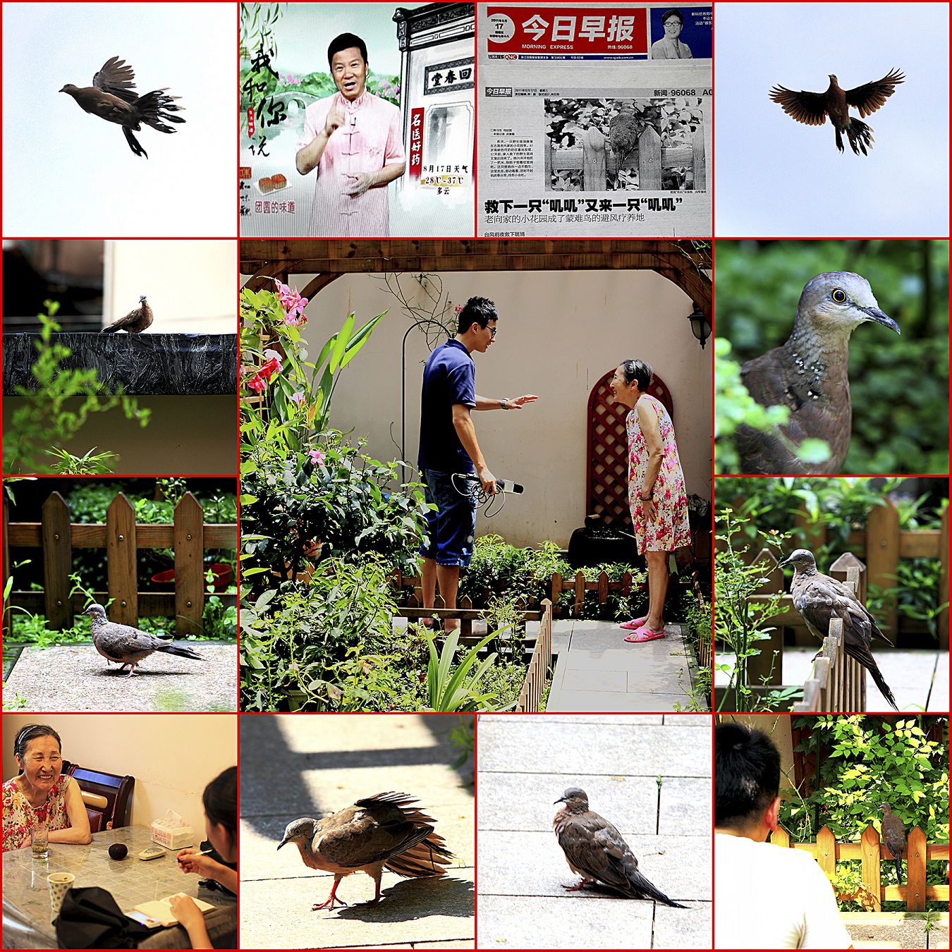 返回頂部>> 照片說(shuō)明: 《杭州上演“人鳥(niǎo)情未了”傳奇》 拍攝時(shí)間:2011年8月5~27日 拍攝地點(diǎn):杭州西湖區(qū)古蕩新村西區(qū) 簡(jiǎn)述:2011年8月4日杭州狂風(fēng)暴雨,83高齡的媽媽在自家小庭院,發(fā)現(xiàn)一只不會(huì)飛的受傷野生斑鳩,取名“嘰嘰”,全家救助五天后,斑鳩傷愈重飛藍(lán)天;驚奇的這是一只懂得感恩的野生斑鳩,第二天就飛回小庭院看望媽媽;自此以后的20多天的日子里,“嘰嘰”每天都會(huì)飛降到院子來(lái)玩,成為“嘰嘰”與媽媽一家的每天一約; 8月17日,浙江《今日早報(bào)》刊登了《救了一只“嘰嘰” 又來(lái)一只“嘰嘰”》大幅報(bào)道,《杭州電視臺(tái)》也采訪報(bào)道。