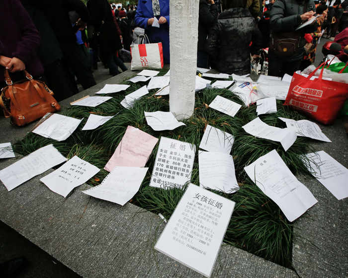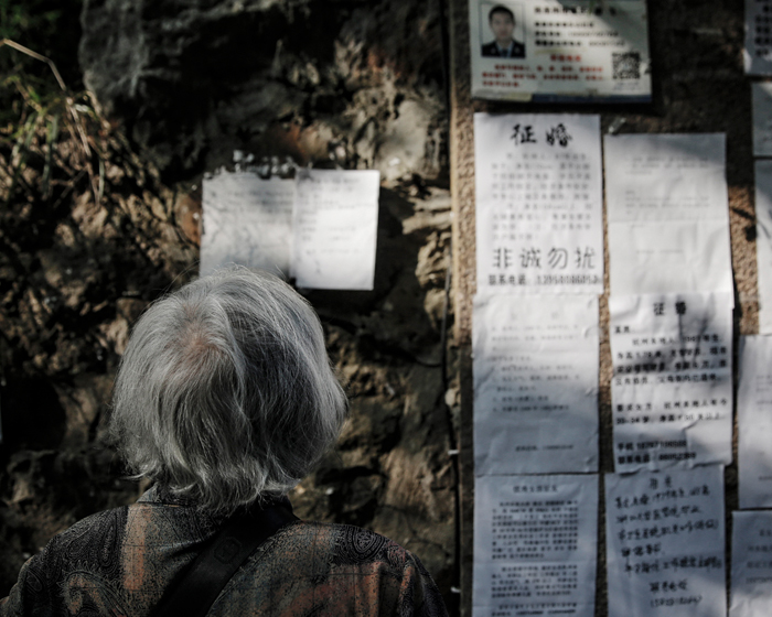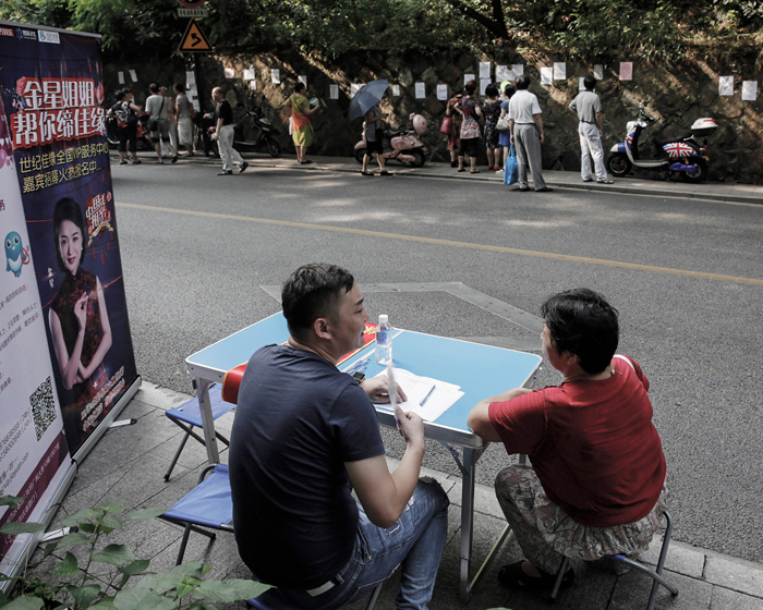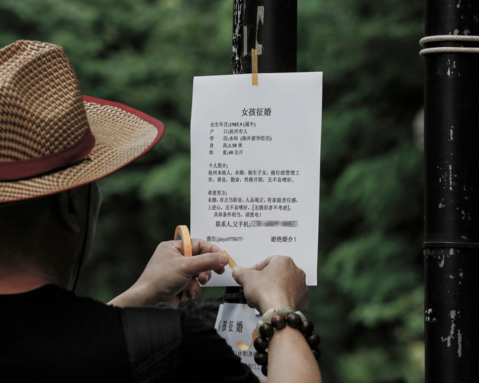作品介紹: 萬松書院是傳說中梁山伯祝英臺在杭州同窗三年的愛情故事發(fā)生地,同時又是明代浙江的最高學府,很多達官貴人都在這里讀過書,文化氛圍濃厚。去年有個周末我偶然經(jīng)過萬松嶺,被這里人山人海的相親人流震撼到。說是相親,其實鮮有年輕人,幾乎全是中老年家長們,他們帶著陔子的簡歷,替孩子尋找意中人。在這里,被征婚的大多是75后和80后的城市中產,以大專、本科學歷為主,博士、碩士、美國名校也不少見。他們或是土生土長的杭州,或是有戶口的新杭州人。隨著經(jīng)濟發(fā)展社會格局變化,高速工作壓力增大,城市特別是高學歷的婚齡男女,每天拿著高檔的電子產品穿梭在高樓舫宇,他們工作能力強,崇尚自由崇尚個人奮斗。他們大多是獨生子在大家庭密罐中長大,曾幾何時,男孩不再是紳士,女孩也巾幗不讓須眉,他們很少為別人付出。更鮮有機會主動接觸異性。“皇帝不急太監(jiān)急”這些50后60后父母們大惑不解。因為他們大多經(jīng)過自由戀愛,那時窮,帶女朋友騎自行車幾十公里看電影,漫步公園漫步鄉(xiāng)間小道的“花前月下”愛情隨時可見。,那時還有詩有吉它有激情。在他們即將進入老年需要膝下兒孫纏繞 時,不得不進入自己年輕時從沒體驗過的場合--相親角,有某種無奈的成分。在這里,我看到了民間團體無私奉獻,看到了羅大姐等熱心人的傾心幫忙。。。。這一切觸動了我某跟神經(jīng),作為婚齡孩子的家長,我感同深受。作為攝影人,我拿起了相機追蹤拍攝,讓社會各界關注這件事,讓孩子們關注這件事。