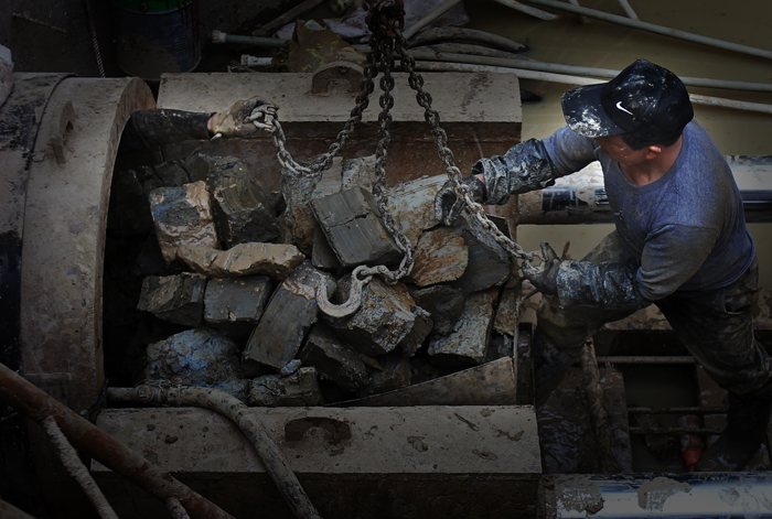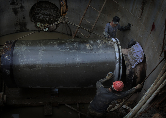 管道狹小而潮濕,別說干活,光蹲著都感覺胸悶,喘不過氣來。攬下這活的工人大多來自農(nóng)村,體格健壯。“我們一組三個(gè)人,基坑上面一個(gè),下面兩個(gè),搬運(yùn)土方是個(gè)體力活,每隔15分鐘左右就需要輪換一個(gè)人!眮碜院幽系亩艁啽笳f道。