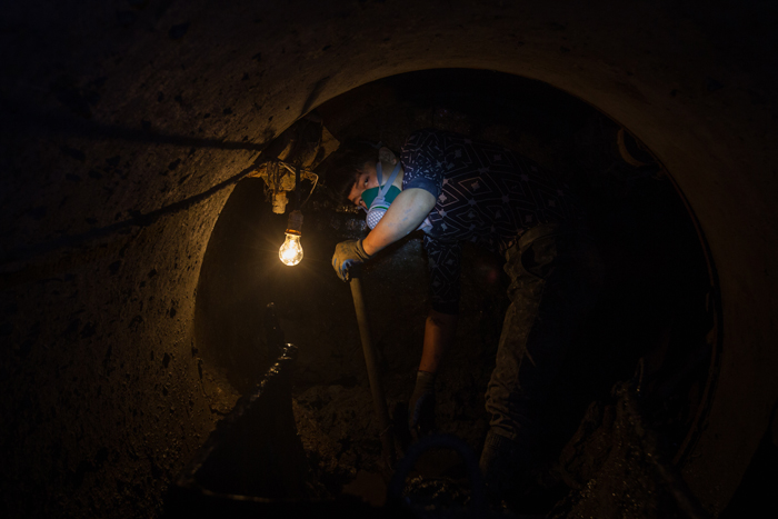 污水管網(wǎng)泵站工程建設(shè)現(xiàn)場(chǎng)除了水就是泥,如沼澤地一般。晚上11點(diǎn)多,春寒料峭,來自麗水的劉仕龍卻穿著短袖在管道中忙碌,額頭上都是汗水。當(dāng)晚,里面的土方發(fā)生了垮塌,劉仕龍的頭被砸到了。地下管道鋪設(shè)的危險(xiǎn)系數(shù)很高,來自江西的李建華晚上施工還挖到了10萬伏的高壓電線,大家都驚出了一身冷汗。而遇到管道里出現(xiàn)黑水和臟泥,工人們只能戴上防毒面具作業(yè),以免發(fā)生中毒昏迷。