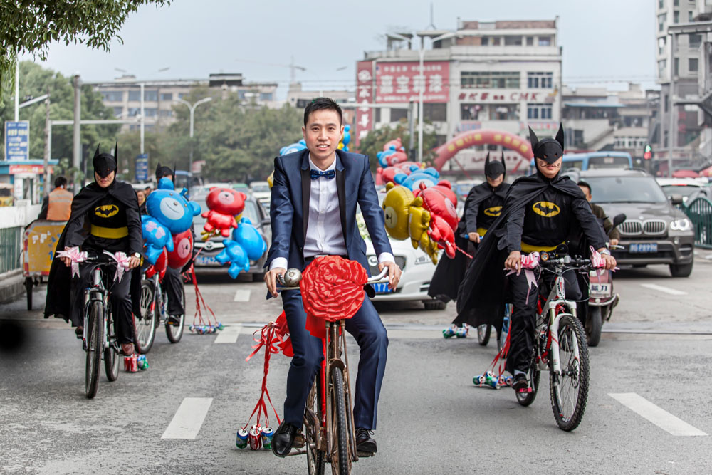 0005 2013年11月15日,一支自行車迎親的隊(duì)伍行走在馬路上,新郎的臉上充滿了笑容。構(gòu)成了新潮迎親的瞬間。