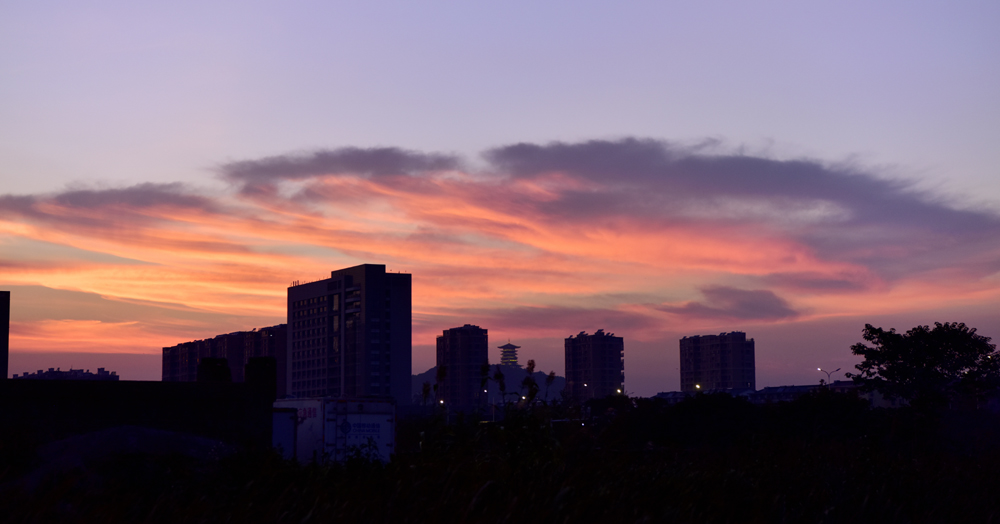 夕陽西沉,彩霞飛揚(yáng),如巨傘籠蓋天空,和建筑成影,剪影如畫。