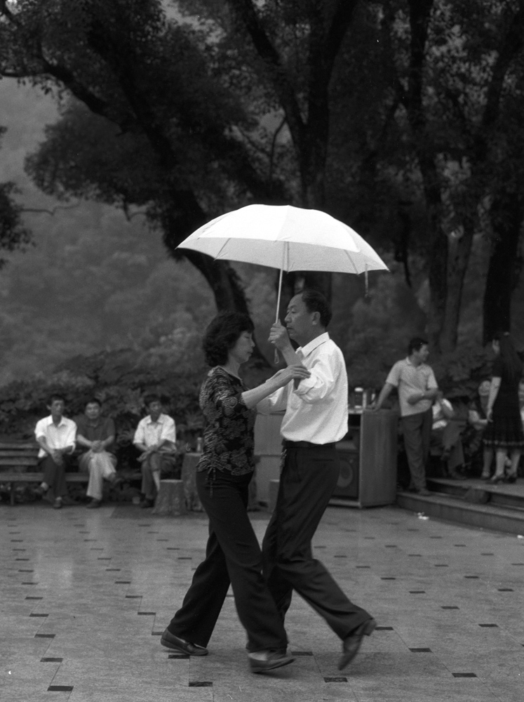 早晨的跳舞場,驟降的急雨讓多數(shù)的舞者到大樹濃蔭下躲避,但仍有舞者撐起雨傘繼續(xù)跳舞。