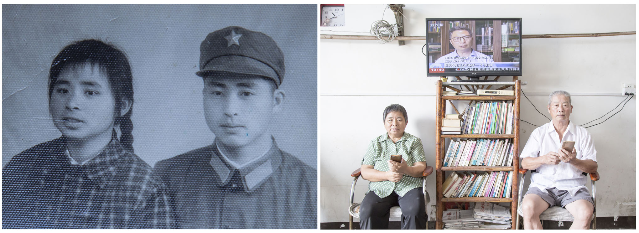 胡化普夫妻現(xiàn)居浙江臺州路橋區(qū)路南街道長浦新村26號。左:1968年胡化普32歲,妻阮少林22歲。右:2019年胡化普83歲,妻阮少林73歲,村部樓道。
