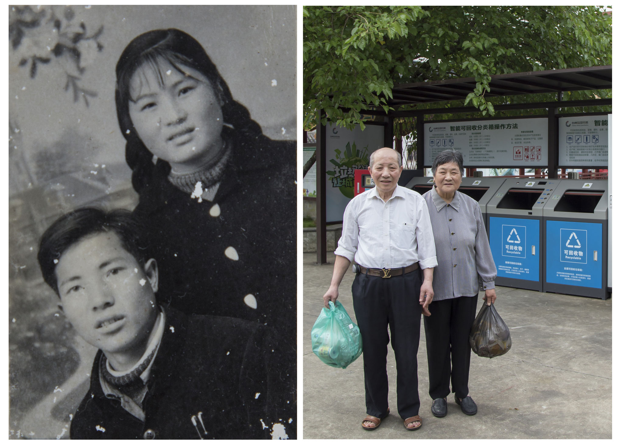 余仙友夫妻現(xiàn)居浙江臺州路橋區(qū)桐嶼街道岙后村2區(qū)43號。左:1964年余仙友23歲,妻朱菊蓮19歲。右:2019年余仙友78歲,妻朱菊蓮74歲,村里智能可回收分類箱。