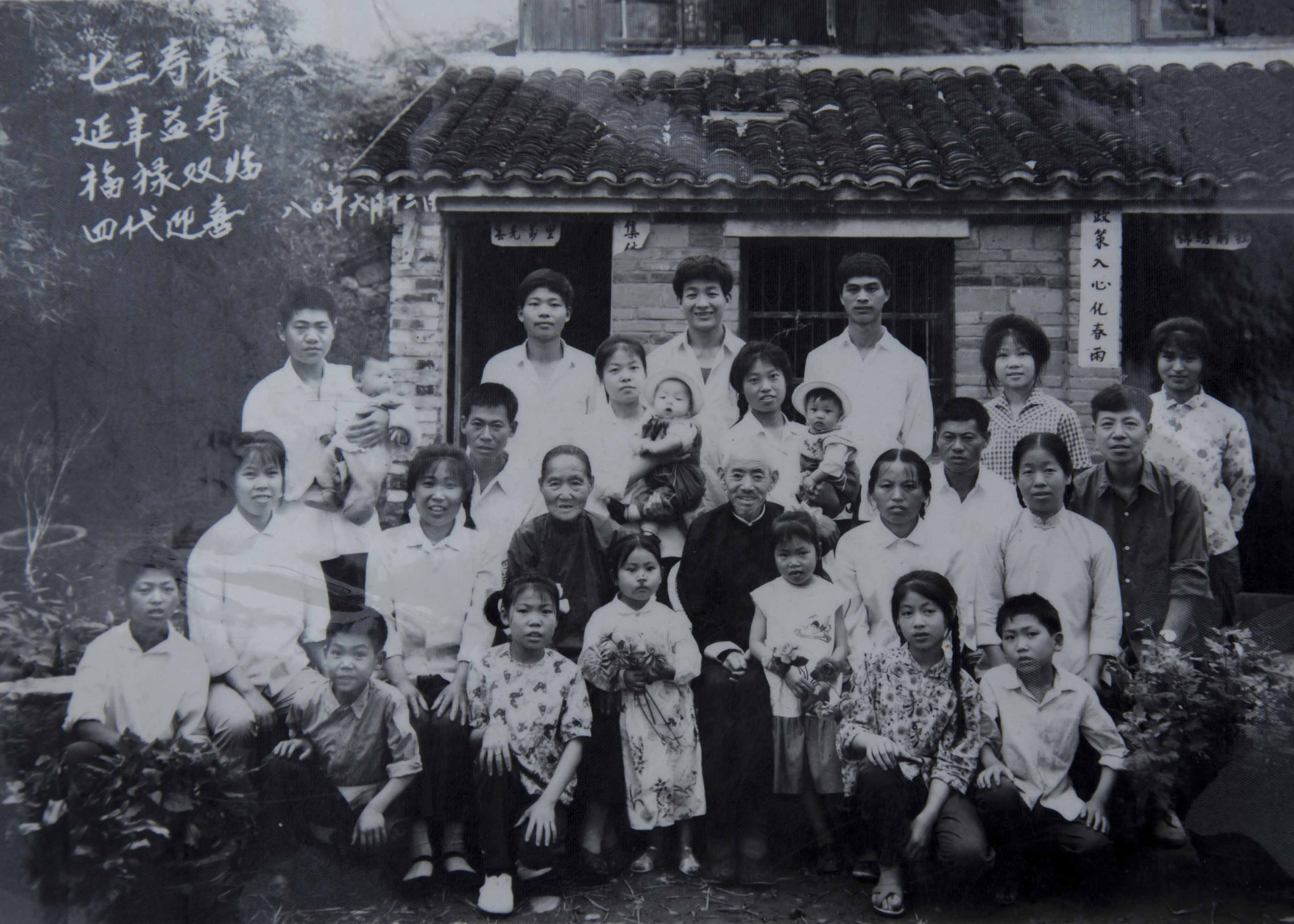 這張照片拍攝于八十年代,陳方蓮(三排右一)的父親73歲壽辰時四代全家福。