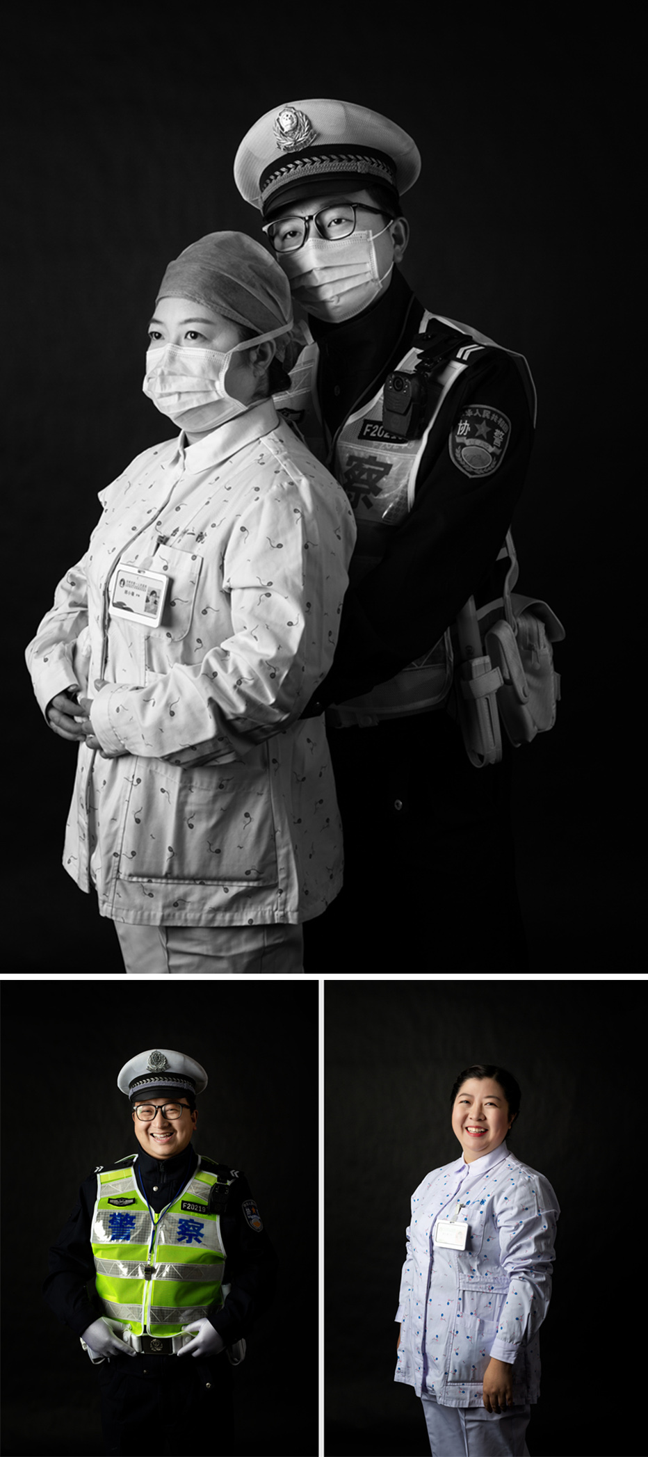 遂積極聯(lián)系,過(guò)程艱難而繁瑣,畢竟,非常時(shí)期,都堅(jiān)守在自己的崗位上。幸好,這個(gè)創(chuàng)意得到了大家的理解和支持,一對(duì)對(duì)警醫(yī)夫妻在拍攝的三天時(shí)間里忙里抽空,來(lái)到我的工作室,用最短的時(shí)間化妝,拍攝,他們的服裝就是他們的工作服,他們的道具就是他們工作中的警用裝備和醫(yī)療器械。拍完以后,沒(méi)有人喝一口水,都迅速返回了自己的工作崗位。他們不是專業(yè)的模特,甚至,有些人面對(duì)鏡頭會(huì)手足無(wú)措,但畫面里,他們的笑是最真實(shí)的,是對(duì)美好生活的向往和執(zhí)著,他們的憂傷也是最真實(shí)的,是對(duì)這場(chǎng)戰(zhàn)疫的感懷和心中固守的堅(jiān)定!