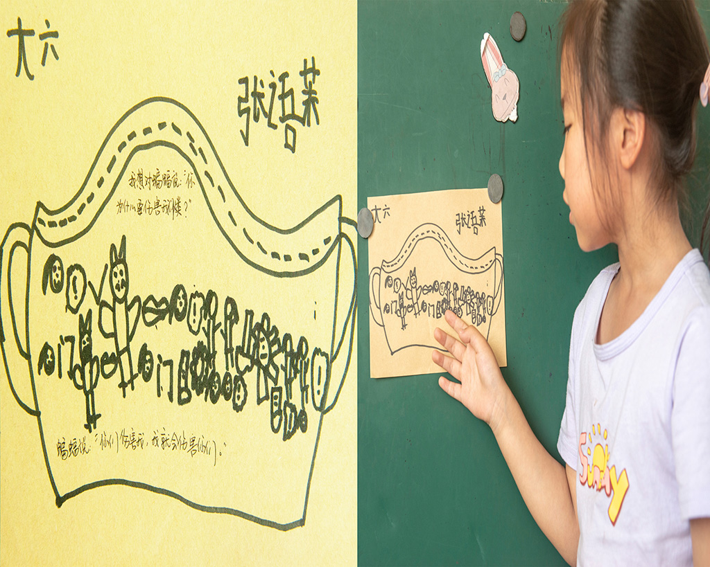 還不會(huì)寫字的幼兒園小朋友在圖畫的口罩上寫下疫情期間的內(nèi)心密語,其內(nèi)容由幼兒園老師翻譯。人圖并置呈現(xiàn)。