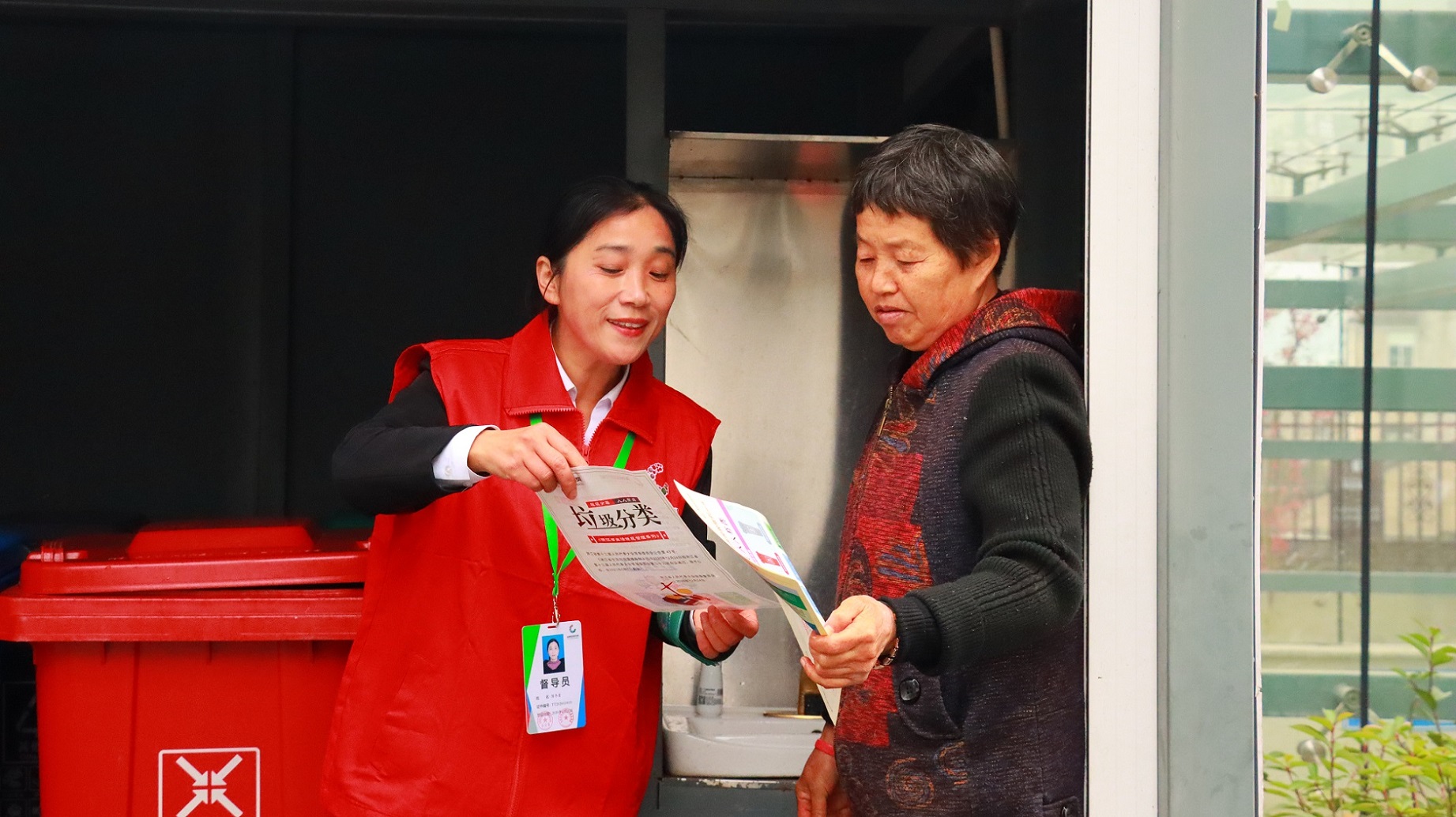 天臺(tái)縣的桶邊督導(dǎo)員熱情洋溢的給前來投放垃圾的小區(qū)居民講解垃圾分類知識(shí),居民正聽得聚精會(huì)神