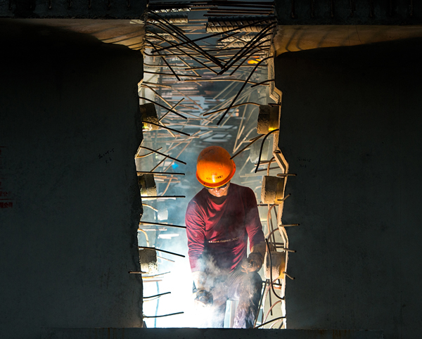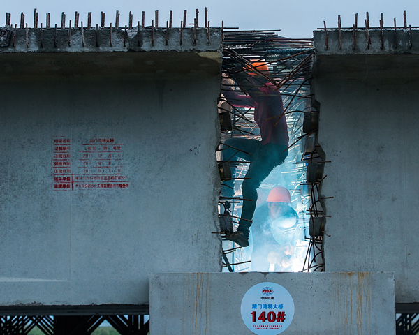 返回頂部>> 照片說明: 大橋建設(shè)工地,錘擊樁與拉鐵索的“交響”中,造橋工人披星戴月地奮斗,高溫下的堅(jiān)守打造了如今的大橋壯景。