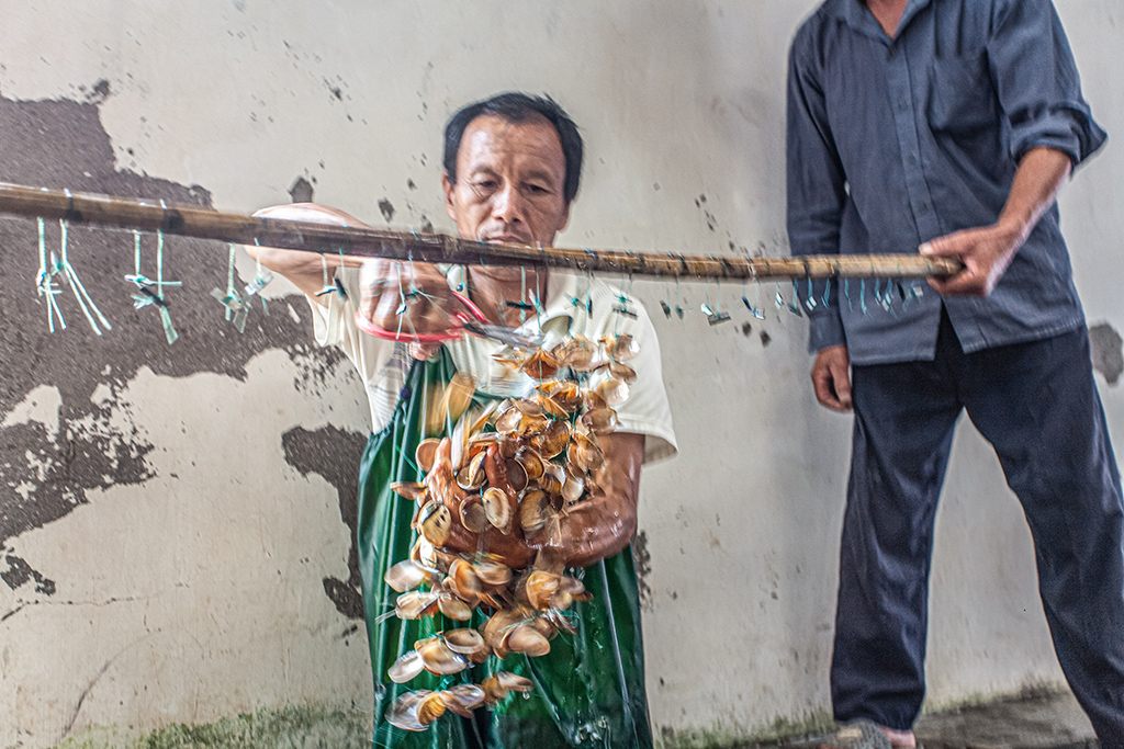 返回頂部>> 照片說(shuō)明: 9、2016.8.31 老陳正在把帶有紫菜苗菌種的蛤蜊剪下(出苗)