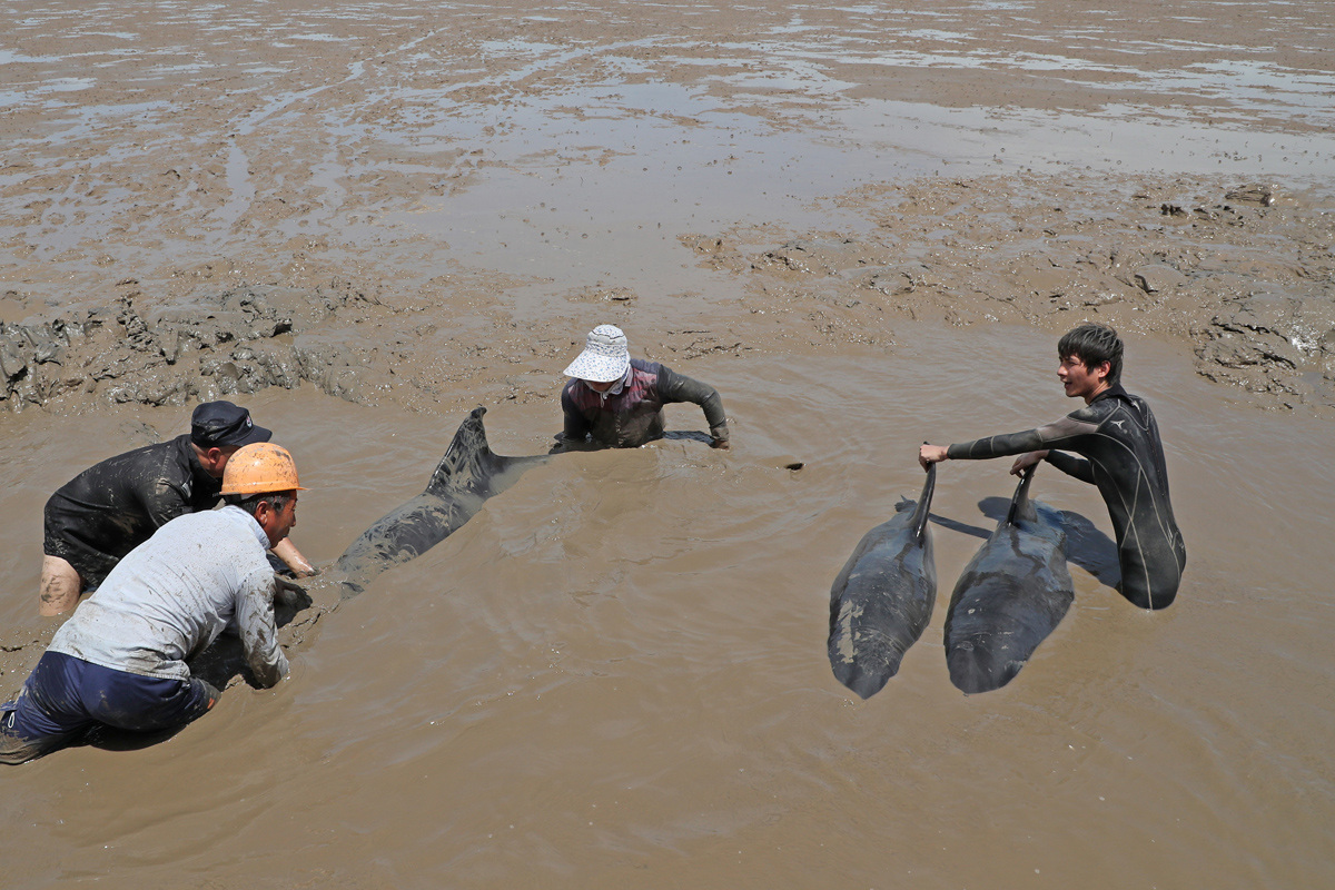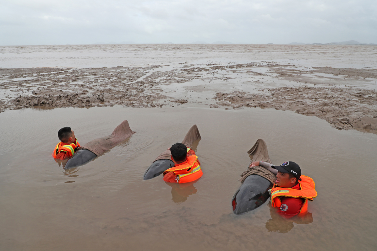 在現(xiàn)場30多攝氏度的高溫下,救援人員和數(shù)百名熱心群眾分工合作,開展?fàn)I救。救援人員和現(xiàn)場群眾一邊在岸邊挖水坑,一邊將擱淺在灘涂上的瓜頭鯨扛到挖好的水坑里。與此同時,大家不斷往瓜頭鯨身上澆水,減少其水分流失。經(jīng)過持續(xù)10多個小時的搶救,當(dāng)天傍晚,最后一頭瓜頭鯨被救援上岸。為避免放歸后再次出現(xiàn)意外,專業(yè)人員建議對兩頭體征正常的瓜頭鯨當(dāng)天放歸大海,其余受傷的瓜頭鯨進(jìn)行體征評估后放歸。