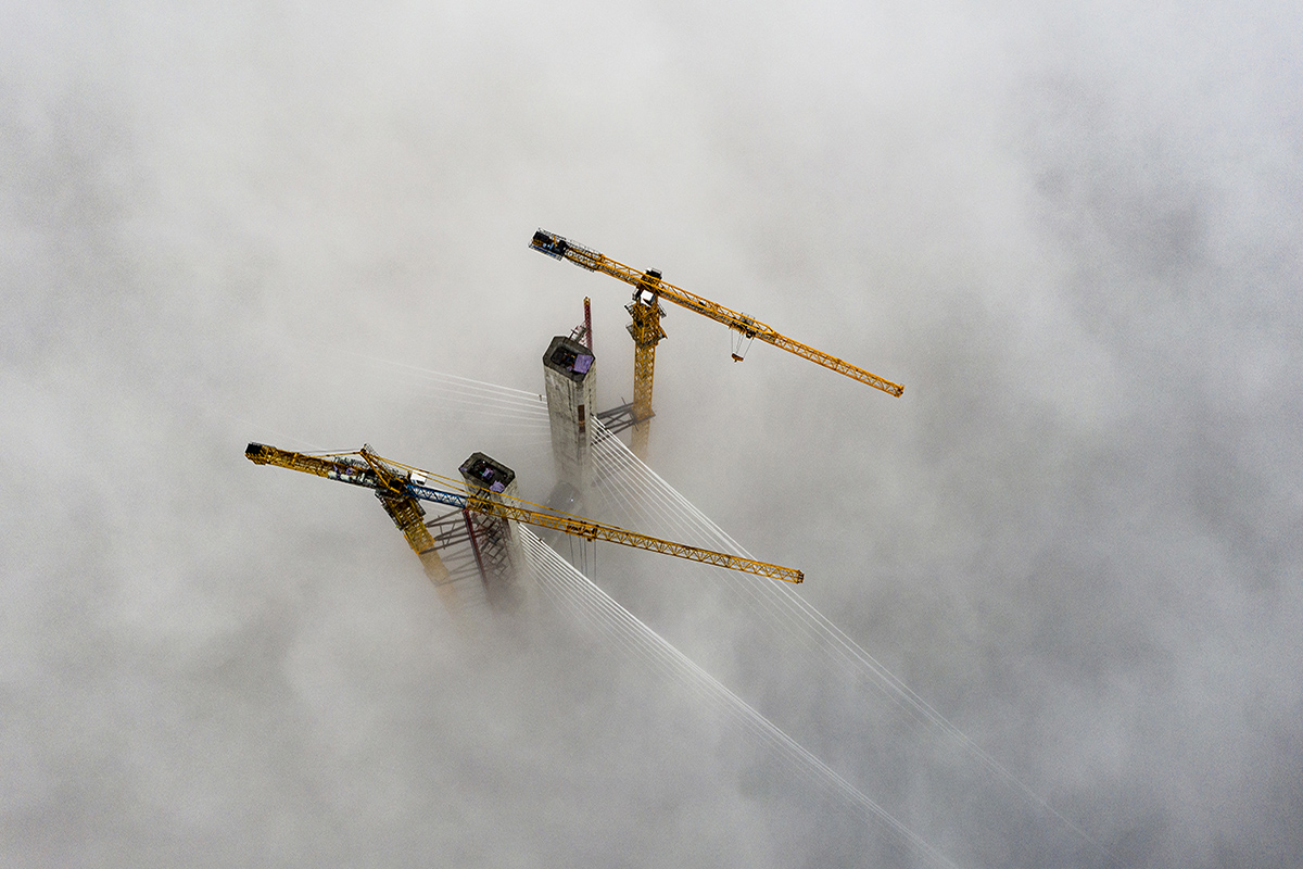 組照18.拍攝于2021年3月27日航拍杭臺高鐵椒江特大橋,因江面濃霧彌漫當(dāng)時(shí)只能看到建設(shè)大橋的吊塔,讓人感覺有點(diǎn)神秘和想象。