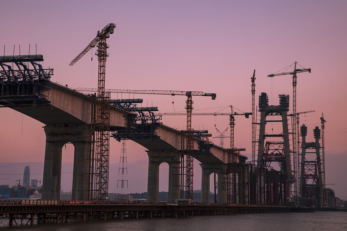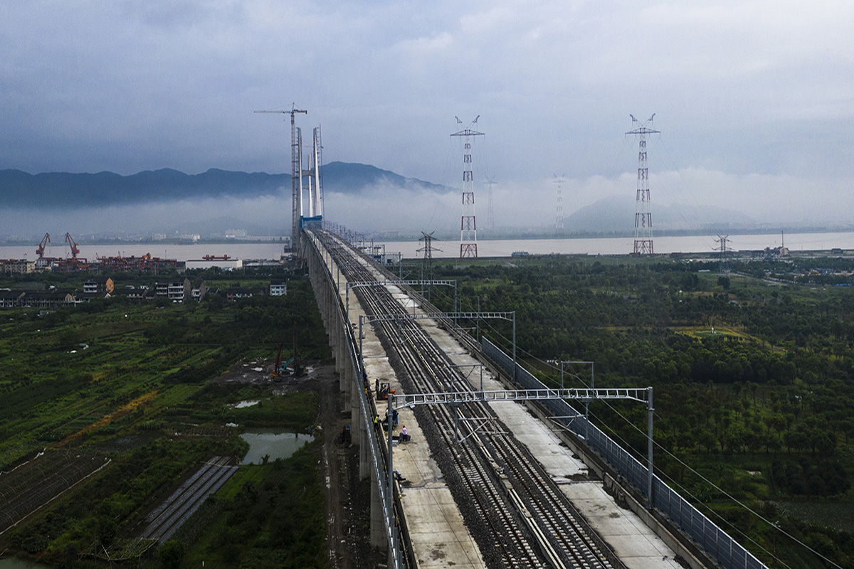 組照12.拍攝于2020年7月9日杭臺高鐵椒江特大橋傍晚時(shí)分的建設(shè)場景。