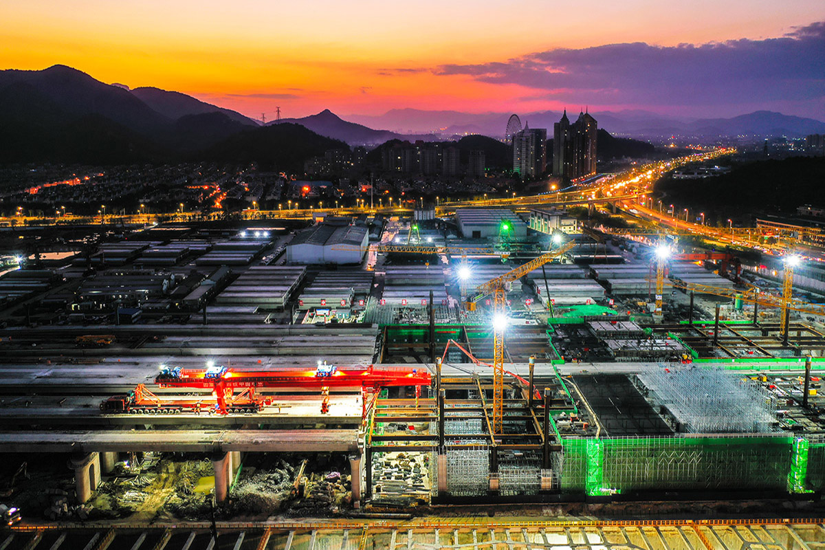 組照17.拍攝于2020年10月10日杭臺高鐵臺州站,通過航拍記錄傍晚時(shí)的建設(shè)場景。