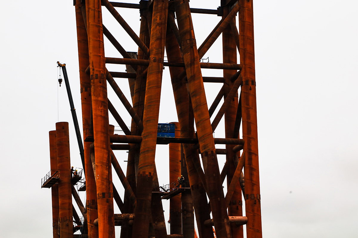組照7.拍攝于2020年6月21日杭臺高鐵椒江特大橋建設(shè)初期,工人師傅們正在架設(shè)鋼架來保障大橋橋墩橋梁順利建設(shè)