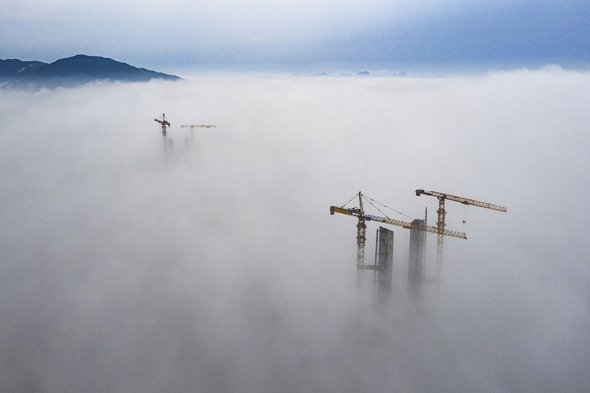組照20.拍攝于2021年3月27日航拍杭臺高鐵椒江特大橋,因江面濃霧彌漫當(dāng)時(shí)只能看到建設(shè)大橋的吊塔。