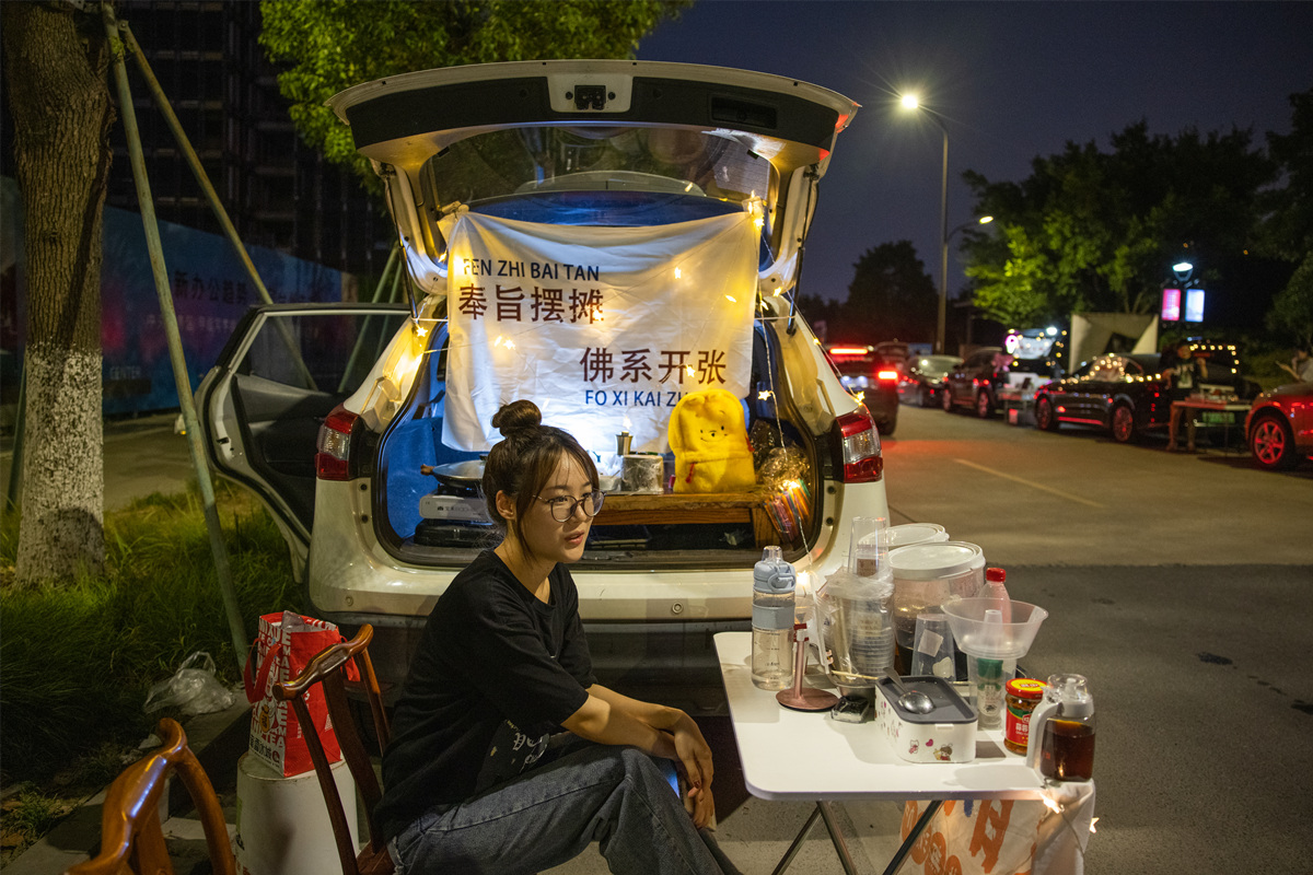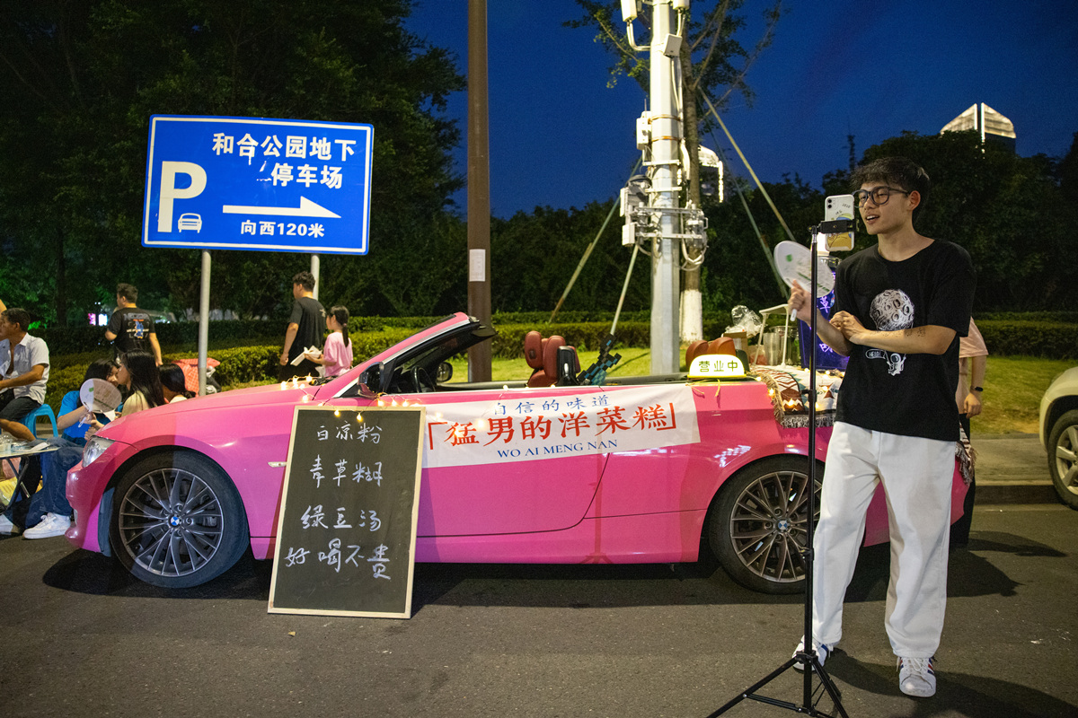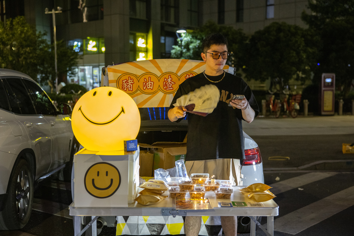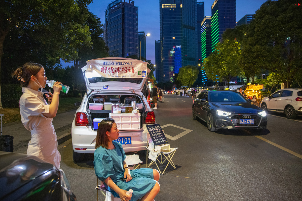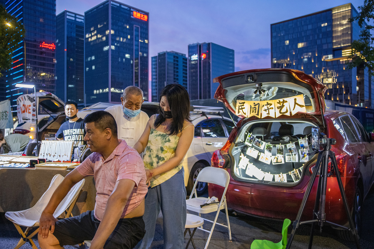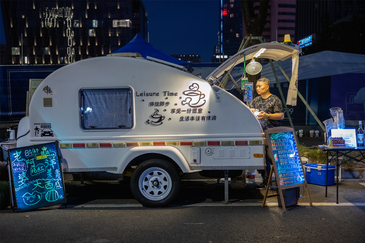 作品介紹: 每當(dāng)夜色來臨,臺州市椒江區(qū)和合公園一角就開始熱鬧起來。在城市CBD間,只見幾十輛私家車有序地停放在空地上,車主們各自把后備箱打開,然后纏一圈氛圍燈,再掛起標(biāo)新立異的攤位招牌,最后在車輛旁邊支起幾張折疊桌椅,一家家微型店鋪就這樣張羅出來了,一個流光溢彩的“后備箱集市”也就成形了。這種令人耳目一新的消費(fèi)場景給許多市民帶來不一樣的消費(fèi)體驗(yàn),每天晚上都吸引不少市民前來“打卡”。