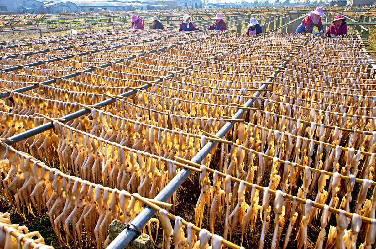 作品介紹: “天下白鲞數(shù)臺(tái)州,臺(tái)州白鲞出松門”。松門,位于浙東南沿海,屬溫嶺市的一個(gè)漁業(yè)重鎮(zhèn),素有“中國(guó)白鲞之鄉(xiāng)”的美譽(yù)。松門魚鲞從選料到剖、腌、洗、曬、包,每道工序都有嚴(yán)格的要求,形成一套自成體系的傳統(tǒng)加工技藝。2009年6月,被列入浙江省非物質(zhì)文化遺產(chǎn)保護(hù)名錄。目前全鎮(zhèn)有十幾家水產(chǎn)專業(yè)合作社、320多家個(gè)體加工戶,上萬(wàn)人從事水產(chǎn)品加工技術(shù)。借助當(dāng)?shù)厝A東地區(qū)最大水產(chǎn)品批發(fā)市場(chǎng)之優(yōu)勢(shì),形成水產(chǎn)生產(chǎn)、加工、包裝、銷售完整產(chǎn)業(yè)鏈,成為當(dāng)?shù)鼐用竦囊豁?xiàng)重要致富行業(yè)。每逢晴朗天氣,從事魚鲞產(chǎn)業(yè)的加工戶們,將收購(gòu)的黃魚、魷魚、海鰻等魚類,當(dāng)肚剖開,去掉內(nèi)臟漂洗后,用鐵絲或線繩穿掛,或直接涼曬在竹器之上,一排排、一行行,村前屋后隨處可見,處處魚鲞飄香,成為當(dāng)?shù)匾坏懒聋惖娘L(fēng)景。