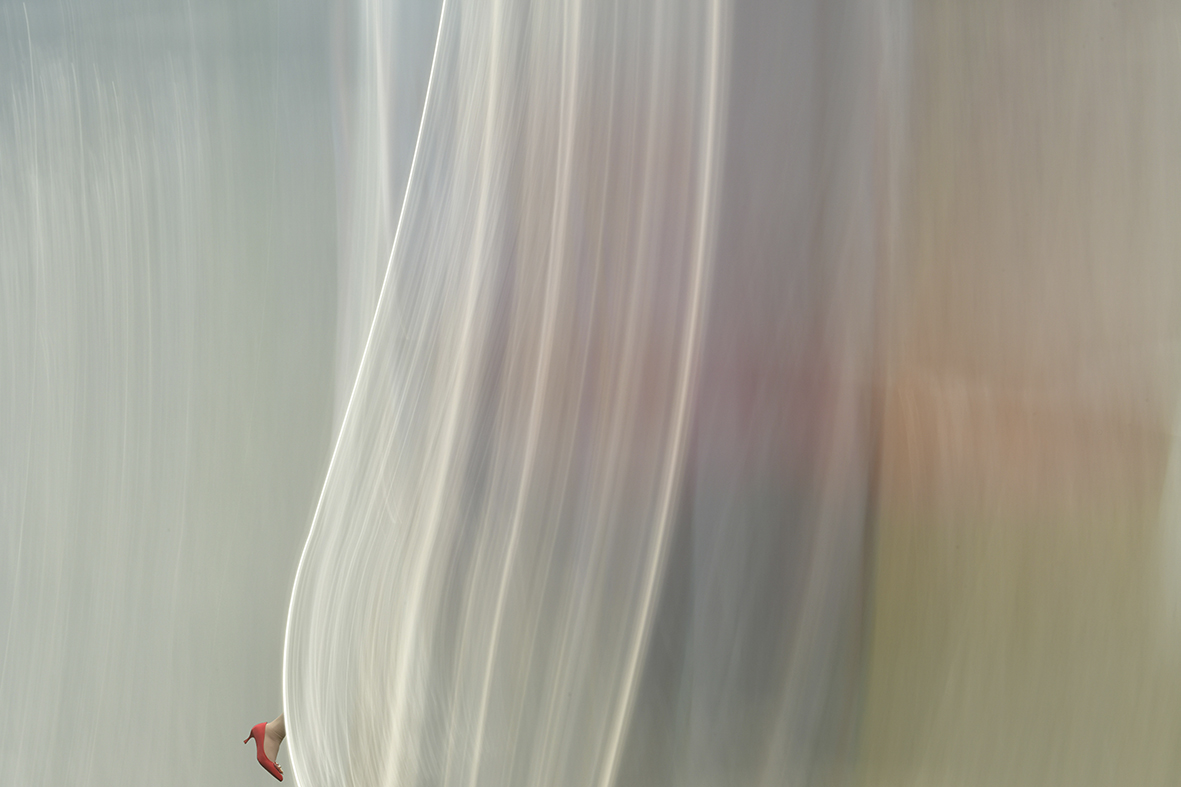 這是一張二次創(chuàng)作的作品。我將3張圖片合在一起,畫面極簡,尤其下面的紅鞋非常吸引眼球,很有視覺沖擊力。