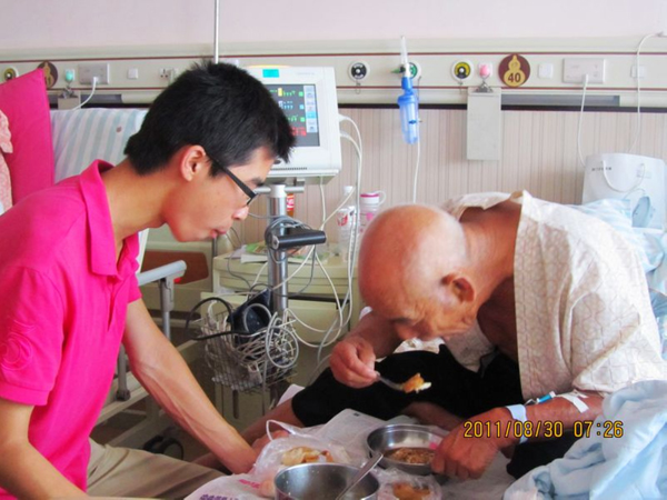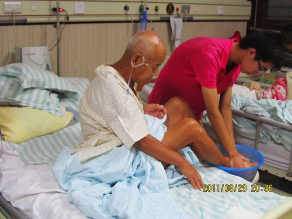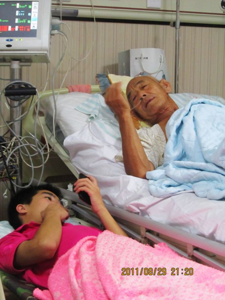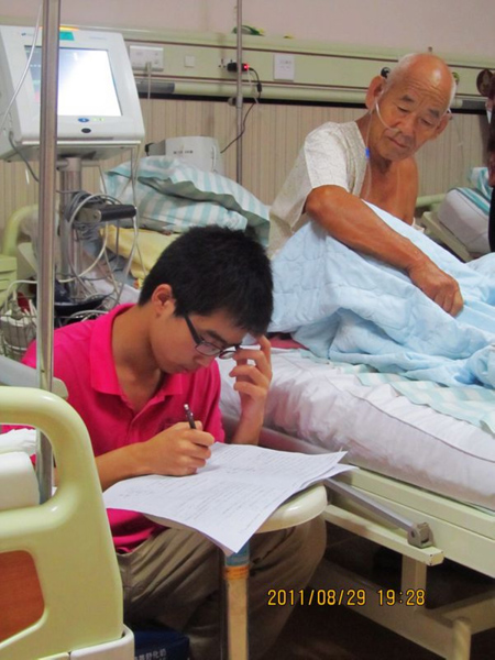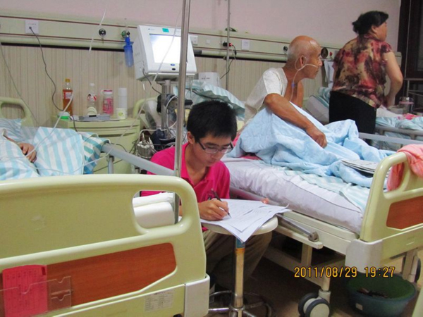 2011年8月29日、河北滄州市中心醫(yī)院 臨近開學,高三年級的王淑健同學趕往醫(yī)院接替家人服侍病重的爺爺,盡一盡孝心。不過王淑健在嘈雜的病房里,還是有條不紊復習功課,爺爺也憐愛地看著孫子學習。