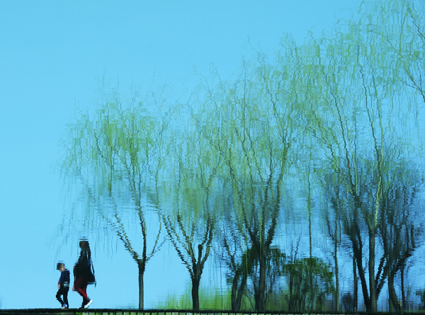 《春波蕩漾》溫嶺錦屏公園柳樹吐新芽,母子兩經(jīng)過小橋,微風(fēng)吹過水面形成漂亮的倒影