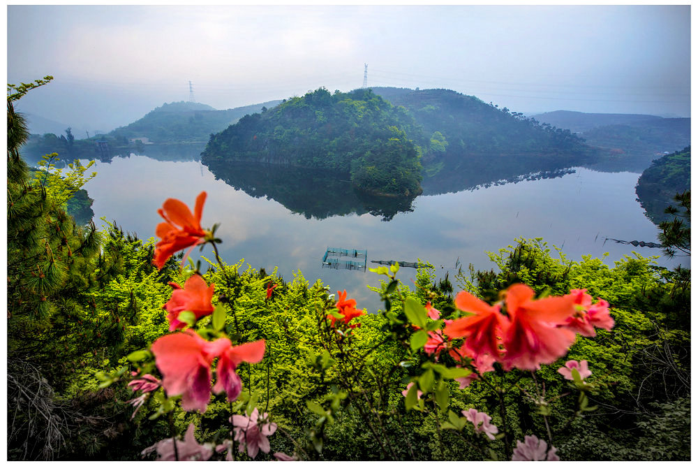 湖漫水庫的岸邊,在5.1前后,盛開的映山紅漫山遍野,湖光山色特別秀美。