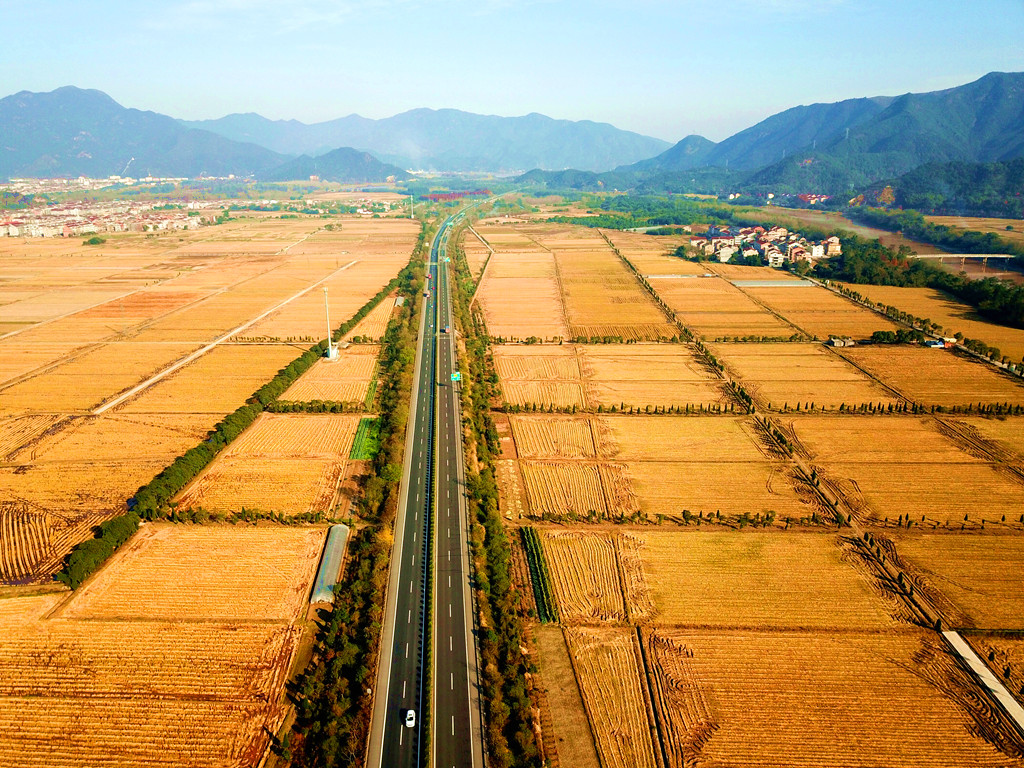 臺金高速是條美麗的通途,這一路段周邊是成片農(nóng)田,稻穗雖已收割,但是田間的稻桿依舊還在,陽光下,金黃色還是這里的主色調(diào)。筆直的高速公路穿過其間,開在這條路上,會有一種美妙的視覺享受。