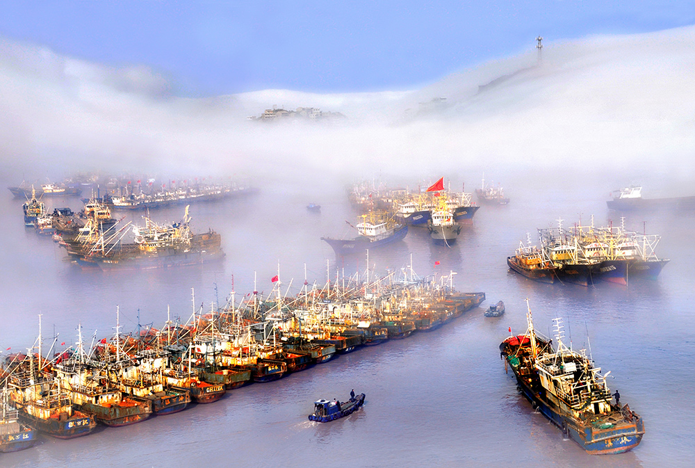 作品介紹: 2013年3月12日下午,因太陽(yáng)的突然出現(xiàn),氣溫的突然升高,連日陰雨濕潤(rùn)的溫嶺市釣浜漁港出現(xiàn)了云海奇觀現(xiàn)象,數(shù)百條整齊排列在港內(nèi)的漁船及岸上的建筑物,在輕紗薄霧中忽影忽現(xiàn),時(shí)有出現(xiàn)海市蜃樓的奇特景觀。