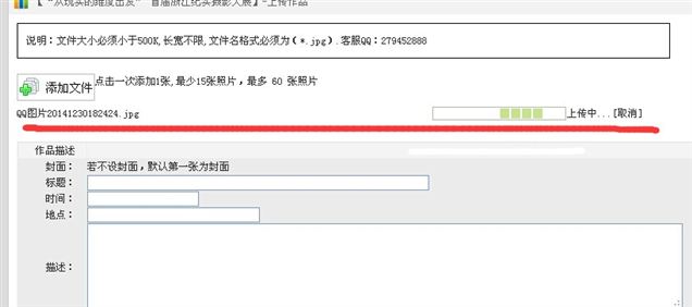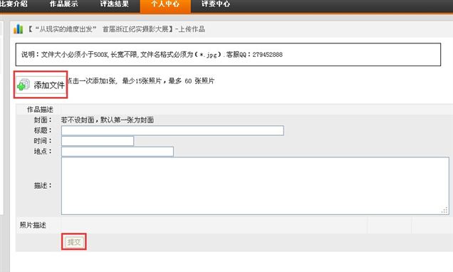 9.當添加的照片達到比賽要求的最低數(shù)量之后,提交按鈕就會點亮,按照要求填寫完照片信息之后,就可以點擊提交按鈕上傳作品了。