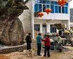 山頭鄭村中的千米老街曾是附近最為繁華的街道,舊時(shí)被稱(chēng)為天臺(tái)“十大市之一”。街口聳立著一株枝繁葉茂、蔥蔥郁郁的古樟樹(shù),樹(shù)根從高高的路面上一直扎到幾米之下的溪中,樹(shù)桿粗得幾個(gè)人張開(kāi)雙臂才能抱住。這株800年歷史的古樟樹(shù)簡(jiǎn)直已經(jīng)成精了,無(wú)論遠(yuǎn)眺,還是近觀(guān),都感覺(jué)到它撲面而來(lái)的一股威風(fēng)和靈氣。街道的盡頭是一片民國(guó)古建筑,雖歷經(jīng)時(shí)代滄桑,卻依舊透露出往日的繁華。路邊的理發(fā)店里,滿(mǎn)頭白發(fā)的老師傅坐在石凳上,數(shù)十年如一日,守護(hù)著這份古樸的生活。